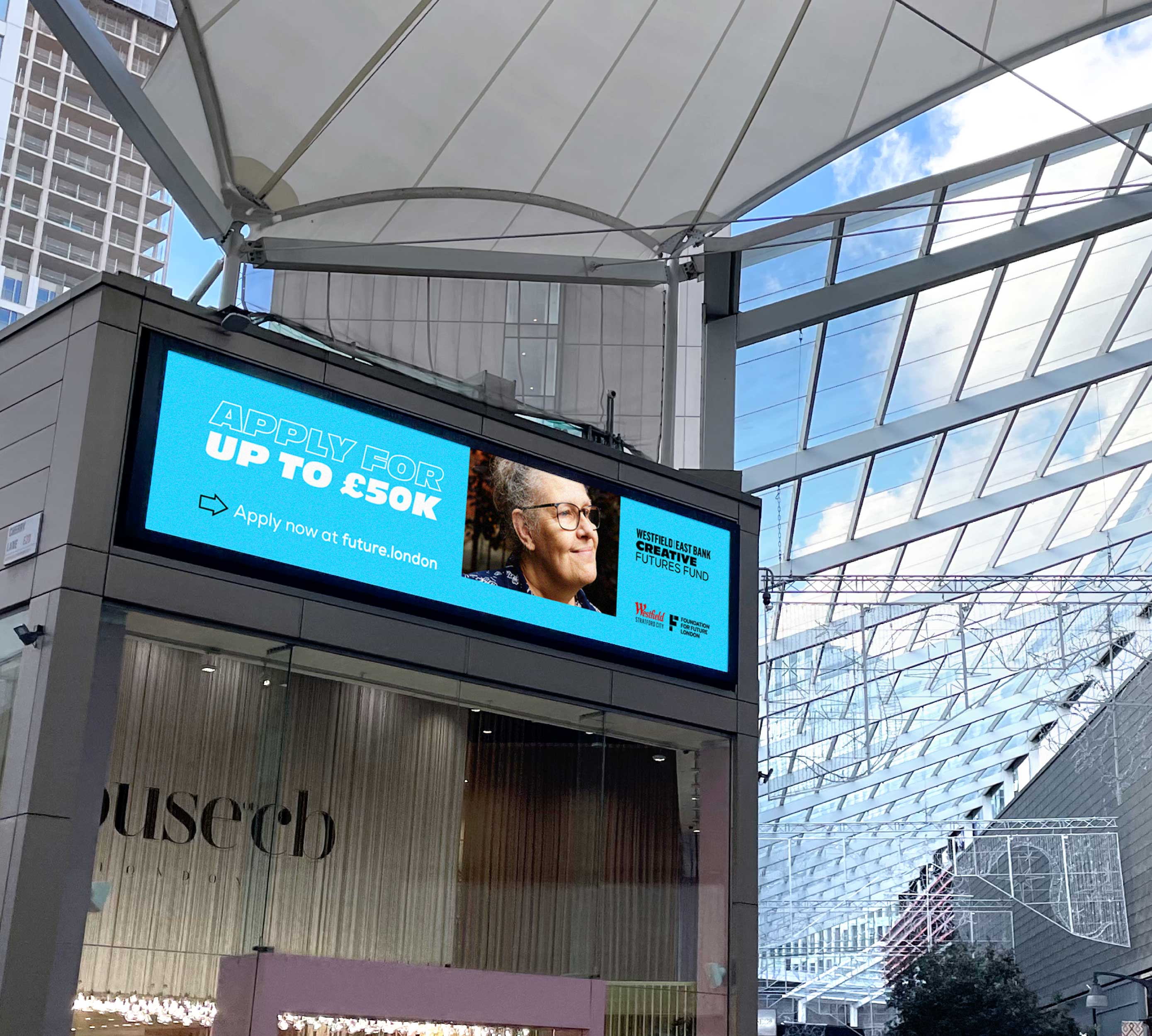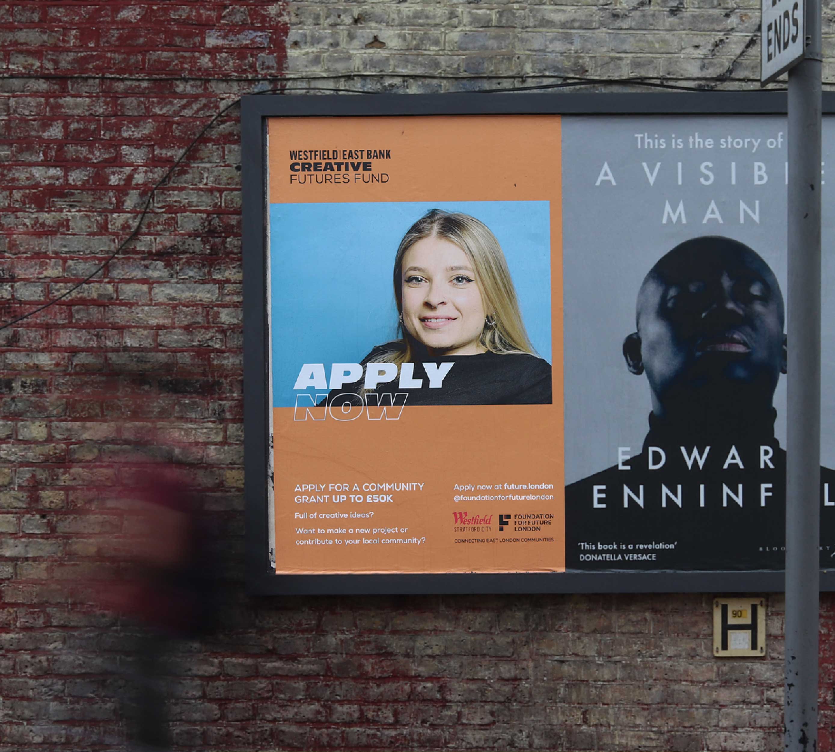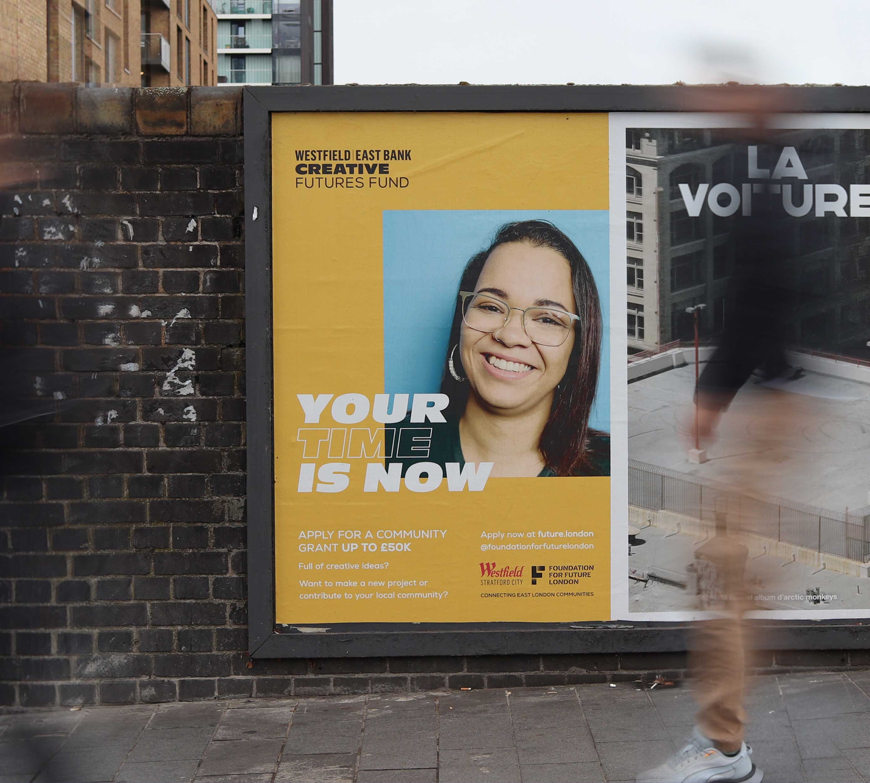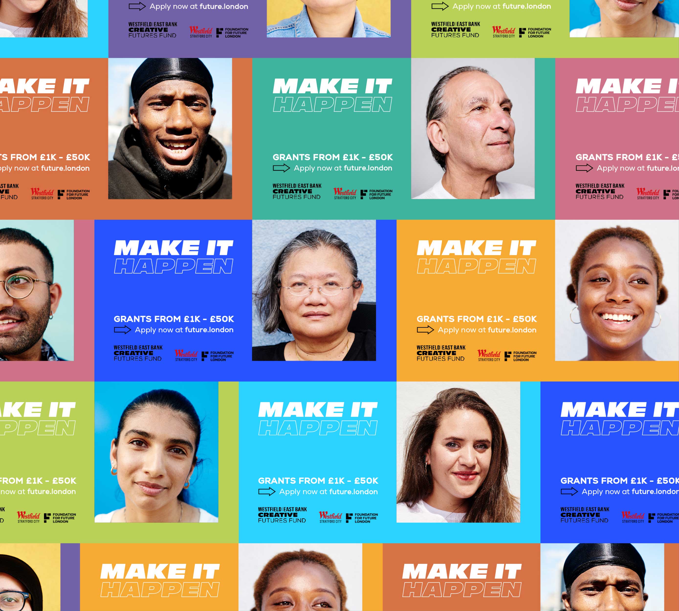 Following our brand refresh for FFL in 2019, our work for the charity has included hoardings at the Olympic Park, annual reports, and campaign design for their Creative Futures Fund 21/22/23 — an initiative run in partnership with Westfield Stratford.